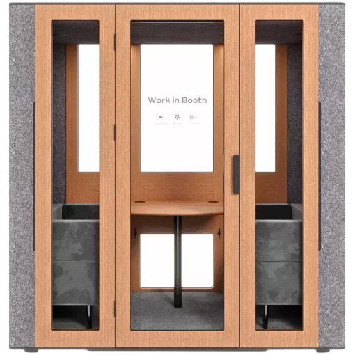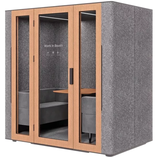 WORKBOOTH Four Acoustic booth with Media hub integration spot, Blind, Light grey felt, natural oak, Jazz Graphite fabric for sofa